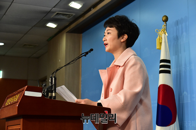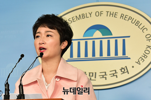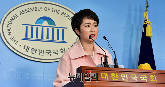이언주 바른미래당 의원이 23일 오후 국회 정론관에서 패스트트랙 합의안 추인에 반발해 탈당을 선언하고 있다.