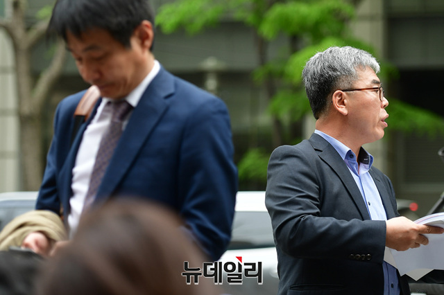 김수민 작가의 법률 대리인 박훈 변호사와 고 장자연 문건을 최초로 보도한 김대오 기자가 23일 오후 서울 종로구 서울지방경찰청에 윤지오에 대한 '허위사실 적시 명예훼손'과 '모욕' 혐의로 고소장을 접수하고 입장을 밝히고 있다.