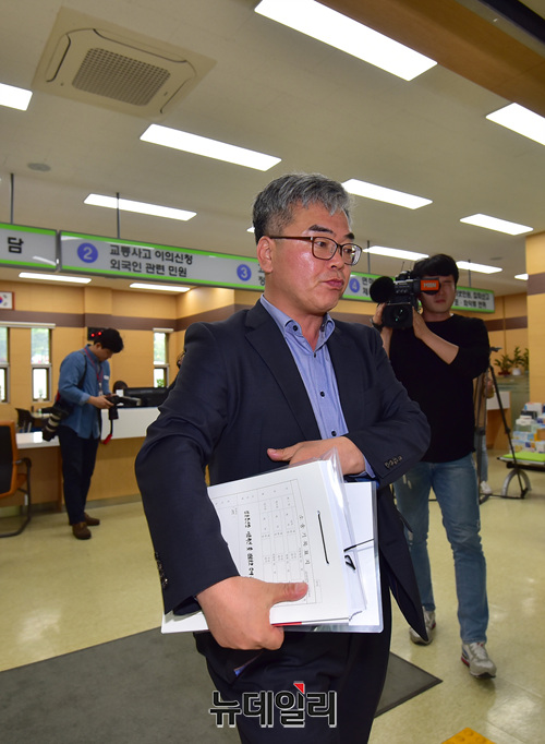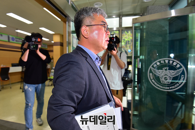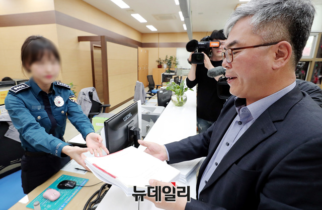 김수민 작가의 법률 대리인 박훈 변호사가 23일 오후 서울 종로구 서울지방경찰청에 고(故) 장자연 사건 주요 증언자인 배우 윤지오 씨에 대해 '허위사실 적시 명예훼손'과 '모욕' 혐의로 고소장을 접수하고 있다.