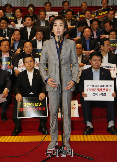 나경원 자유한국당 원내대표가 23일 오후 국회 로텐더홀에서 여야 4당의 패스트트랙 합의안 추인을 규탄 발언을 하고 있다.