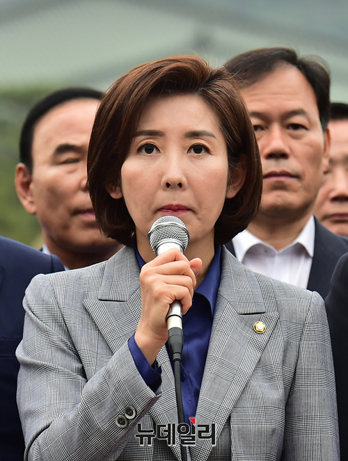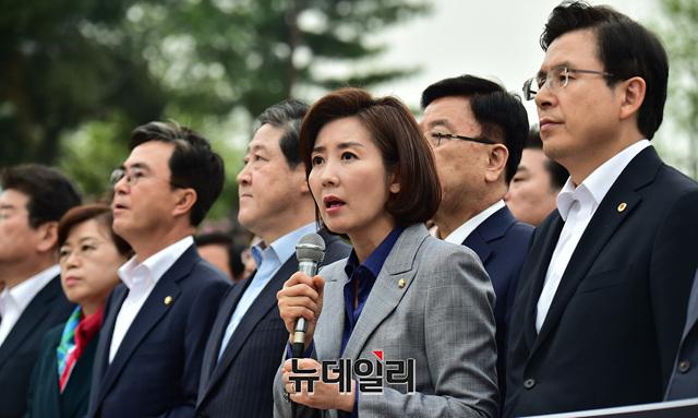 나경원 자유한국당 원내대표가 23일 오후 서울 종로구 청와대 앞 분수대 앞에서 열린 패스스트랙 저지를 위한 규탄대회에서 발언을 하고 있다.