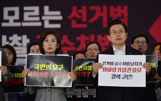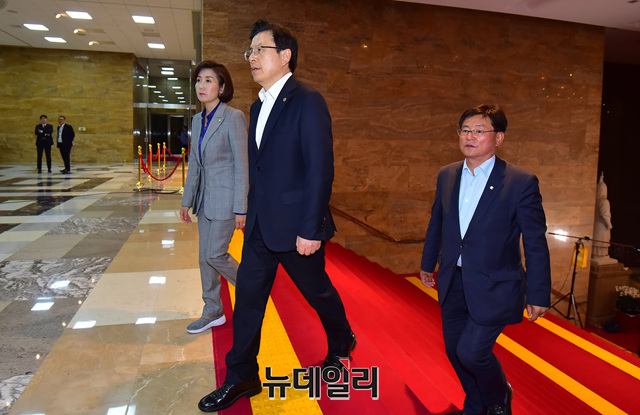 황교안 자유한국당 대표, 나경원 원내대표가 23일 오후 국회 로텐더홀에서 열린 긴급의원총회에 입장하고 있다. 자유한국당은 더불어민주당·바른미래당·민주평화당·정의당 등 4당의 선거제·개혁법안 패스트트랙(신속처리안건 지정) 합의안 추인에 맞서 이날 오후 9시에 긴급 의총을 열고 무기한 철야 농성에 돌입했다.