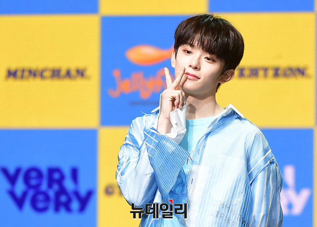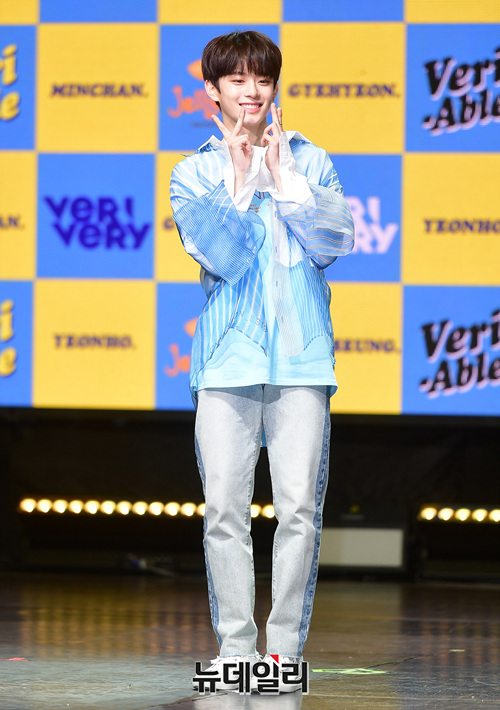 7인조 아이돌그룹 '베리베리(VERIVERI)' 막내 멤버 강민이 24일 오전 서울 광진구 예스24라이브홀에서 열린 2번째 미니앨범 'VERI-ABLE(베리어블)' 쇼케이스에서 포토타임을 갖고 있다.