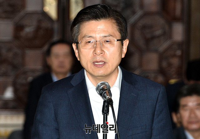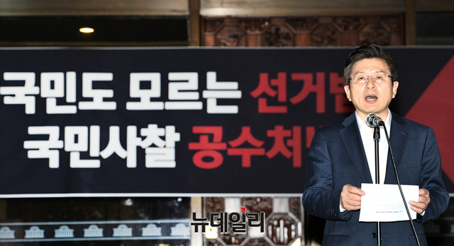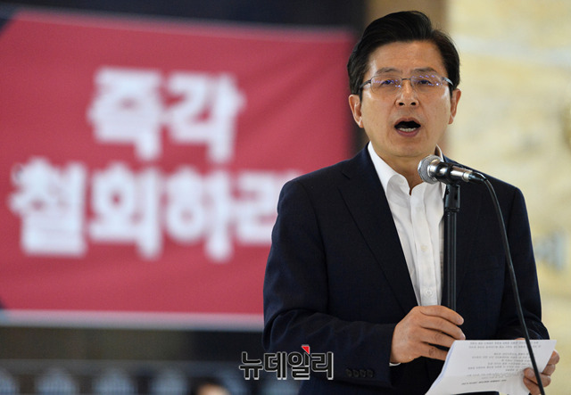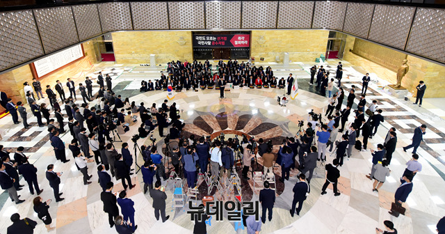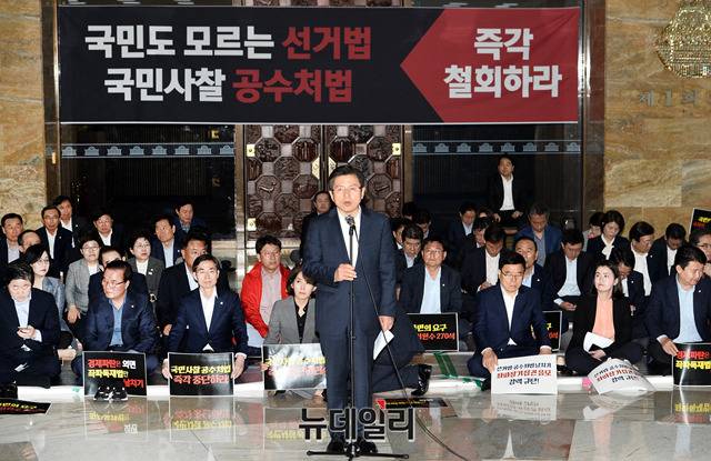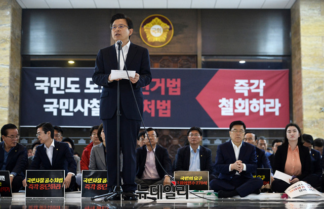 황교안 자유한국당 대표가 24일 오전 국회 로텐더홀에서 열린 비상의원총회에서 선거법·공수처법 여야4당 패스트트랙 즉각 철회를 요구하며 규탄 발언을 하고 있다. 앞서 자유한국당은 23일 청와대 앞에서 공수처법 연계 패스트트랙 합의안을 규탄하는 기자회견을 갖고, 오후 9시에 국회로 복귀해 철야농성을 이어갔다.