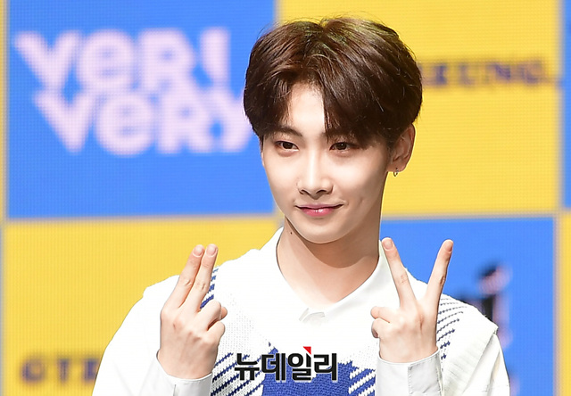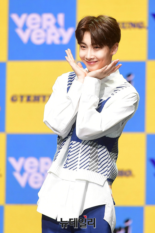 7인조 아이돌그룹 '베리베리(VERIVERI)' 멤버 호영이 24일 오전 서울 광진구 예스24라이브홀에서 열린 2번째 미니앨범 'VERI-ABLE(베리어블)' 쇼케이스에서 포토타임을 갖고 있다.