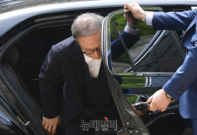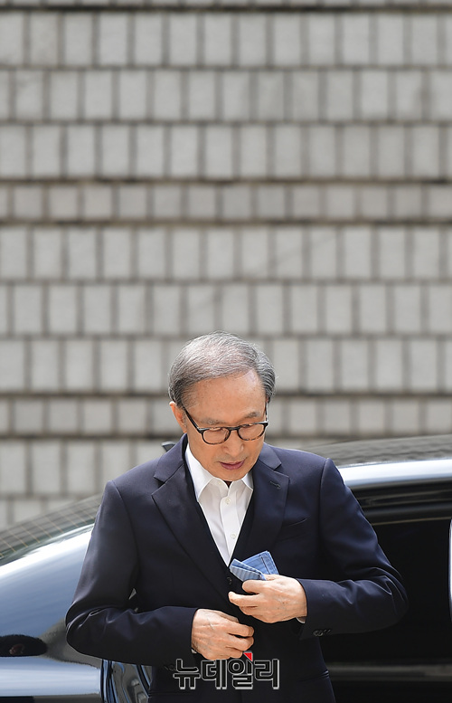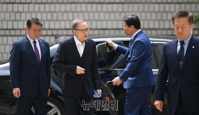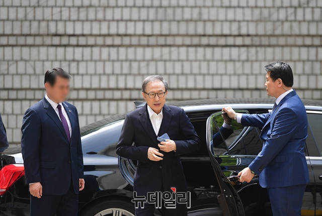 이명박 전 대통령이 24일 오후 서울 서초구 서울고등법원에서 열린 재판에 참석하기 위해 차량에서 내리고 있다. 이날 증인신문이 예정된 김백준 전 청와대 총무기획관은 입원을 이유로 불출석 할 예정이다.