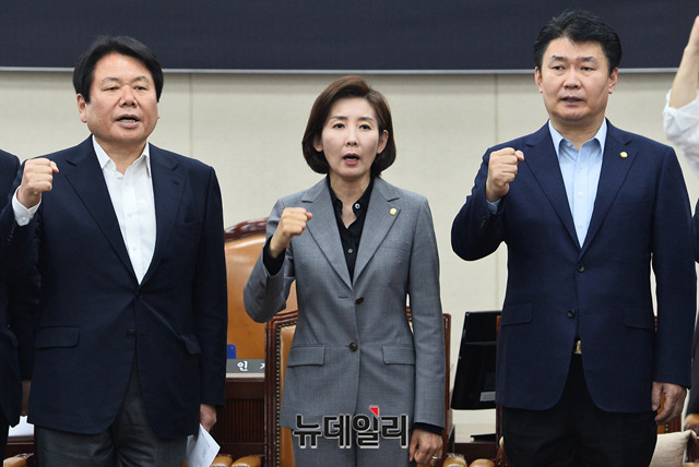 나경원 자유한국당 원내대표를 포함한 한국당 의원들이 24일 오후 국회 행정안전위원회의실에서 열린 긴급 의원총회에서 '동료의원 성폭행한 문희상 국회의장 사퇴하라'는 현수막을 걸고 구호를 외치고 있다.