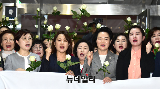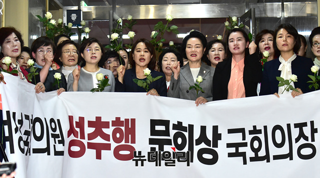 자유한국당 소속 여성의원, 여성당직자, 여성보좌진들이 24일 오전 국회 의장실을 찾아 백장미를 들고, 문희상 국회의장의 임이자 의원 성추행과 관련해 규탄 구호를 하고 있다.