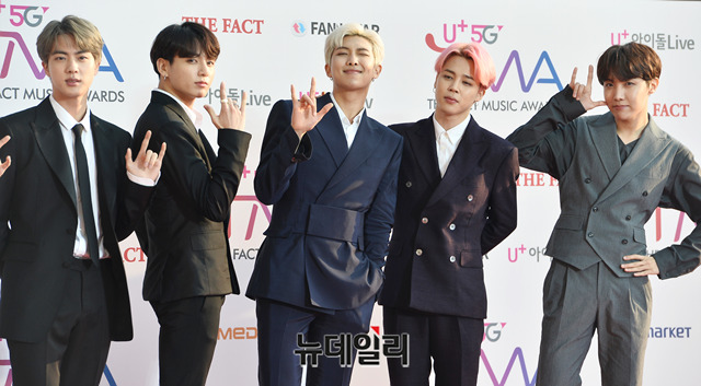 방탄소년단(BTS)이 24일 오후 인천 남동구 인천남동체육관에서 열린 'U+5G 더팩트 뮤직 어워즈(THE FACT MUSIC AWARDS)'에 참석해 포토타임을 갖고 있다. (인천=박성원 기자)