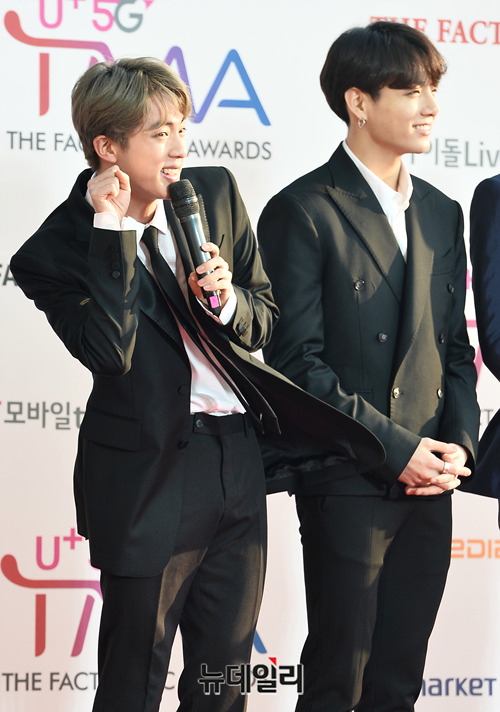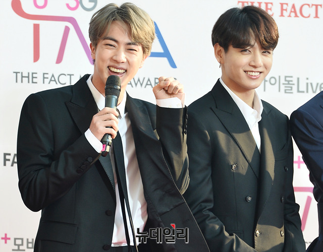 방탄소년단(BTS) 진(왼쪽), 정국이 24일 오후 인천 남동구 인천남동체육관에서 열린 'U+5G 더팩트 뮤직 어워즈(THE FACT MUSIC AWARDS)'에 참석해 포토타임을 갖고 있다. (인천=박성원 기자)