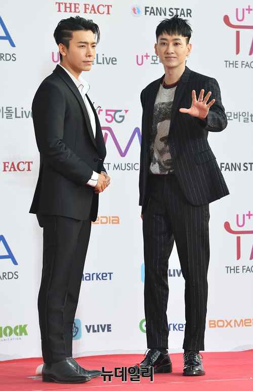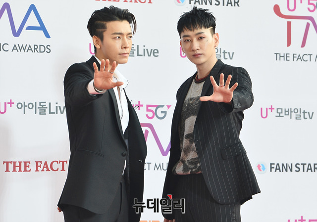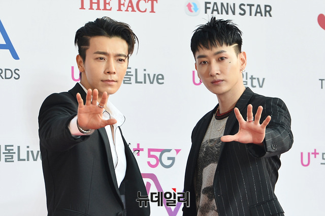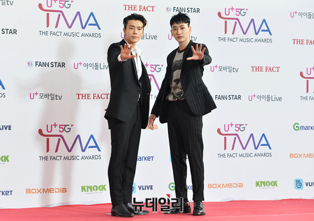슈퍼주니어 동해(왼쪽), 은혁이 24일 오후 인천 남동구 인천남동체육관에서 열린 'U+5G 더팩트 뮤직 어워즈(THE FACT MUSIC AWARDS)'에 참석해 포토타임을 갖고 있다. (인천=박성원 기자)