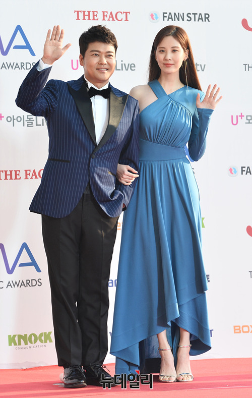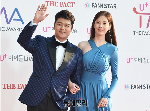 아나운서 전현무(왼쪽)와 가수 겸 배우 서현이 24일 오후 인천 남동구 남동체육관에서 열린 'U+5G 더팩트 뮤직 어워즈(THE FACT MUSIC AWARDS)'에 참석해 포토타임을 갖고 있다. (인천=박성원 기자)