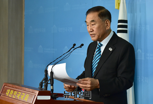 이재오 4대강 국민연합 공동대표가 25일 오전 국회 정론관에서 조명래 환경부 장관 등 4대강 보 해체를 주도한 7명을 검찰 고발하겠다는 기자회견을 갖고 있다.
