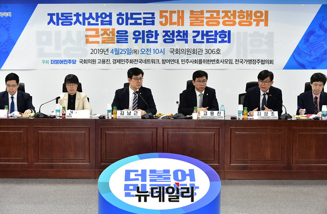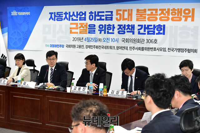 '자동차산업 하도급 5대 불공정행위 근절을 위한 정책간담회'가 25일 오전 국회 의원회관에서 고용진 더불어민주당 의원, 김상조 공정거래위원장 등이 참석한 가운데 열리고 있다.