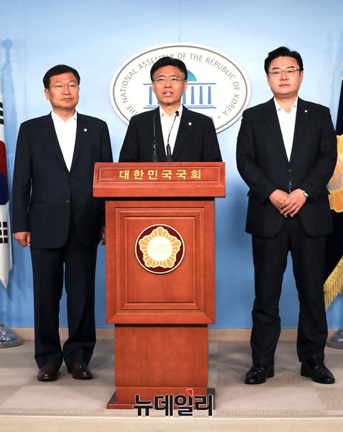 자유한국당 김성원·최교일·정점식 의원이 25일 오전 국회 정론관에서 국회의장의 오신환 바른미래당 사보임 허가를 효력정지 가처분 신청 기자회견을 갖고 있다.