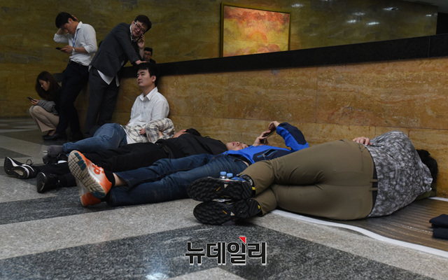 [포토] 의안과 앞에서 쪽잠 자는 한국당 보좌진