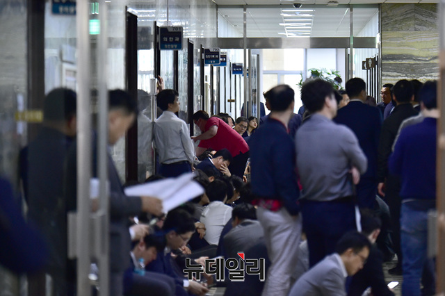 자유한국당 의원 및 보좌진이 26일 오전 국회 의안과 문을 지키며 쪽잠을 자고 있다. 한국당은 더불어민주당의 고위공직자범죄수사처(공수처)법을 제출을 막기위해 의안과 출임문을 봉쇄했다.