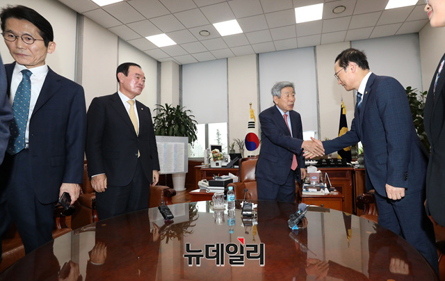 여야 3당 원내대표가 26일 오후 국회 사무총장실을 방문해 유인태 국회 사무총장에게 자유한국당의 의안과 점거 관련 항의를 하기 앞서 홍영표 더불어민주당 원내대표가 유 사무총장과 악수를 나누고 있다.