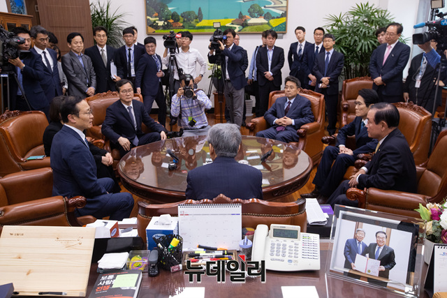 [포토] 유인태 국회 사무총장 찾은 여야 3당 원내대표