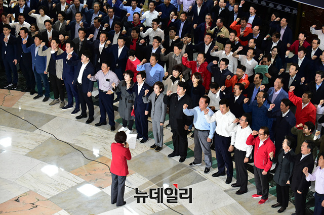 나경원 자유한국당 원내대표 등 소속 의원들이 26일 오후 국회 로텐더홀에서 열린 긴급의원총회에서 구호를 외치고 있다.