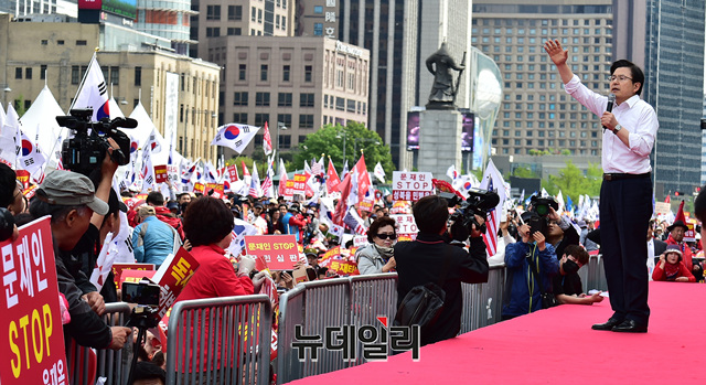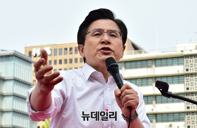 황교안 자유한국당 대표가 27일 오후 서울 광화문 세종문화회관 앞에서 열린 '문재인 STOP!, 국민이 심판합니다!' 2차 집회에서 발언을 하고 있다.