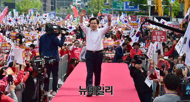 황교안 자유한국당 대표가 27일 오후 서울 광화문 세종문화회관에서 열린 '문재인 STOP! 국민이 심판합니다!' 2차 집회에서 발언에 앞서 참석자들에게 손을 들어 인사하고 있다.