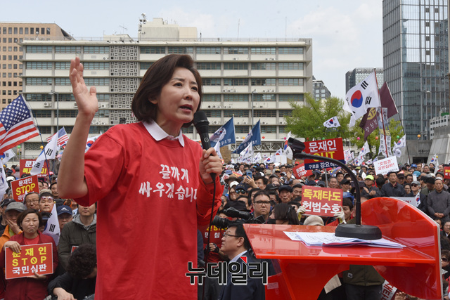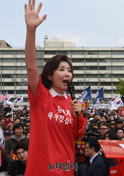 나경원 자유한국당 원내대표가 27일 오후 서울 광화문 세종문화회관에서 열린 '문재인 STOP!, 국민이 심판합니다!' 2차 집회에서 발언을 하고 있다.