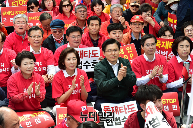 황교안 자유한국당 대표와 나경원 원내대표가 27일 오후 서울 광화문 세종문화회관에서 열린 '문재인 STOP!, 국민이 심판합니다!' 2차 집회에 참석해 구호를 외치고 있다.