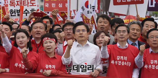 황교안 자유한국당 대표, 소속 의원, 당원들이 27일 오후 서울 광화문 광장에서 열린 '문재인 STOP!, 국민이 심판합니다!' 2차 집회를 마치고 청와대로 행진하고 있다.