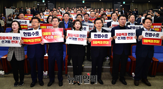 황교안 자유한국당 대표와 나경원 원내대표 등 소속의원들이 29일 오전 국회에서 열린 비상의원총회에서 '좌파독재 반대' 구호를 외치고 있다.