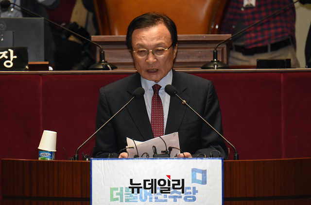 이해찬 더불어민주당 대표가 29일 오전 국회에서 열린 의원총회에서 모두발언을 하고 있다.
