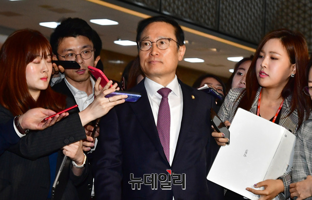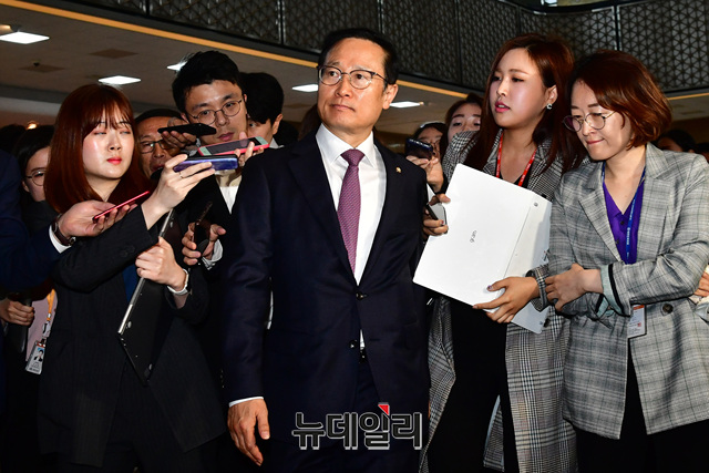 홍영표 더불어민주당 원내대표가 29일 오전 국회에서 열린 의원총회에 참석하기 위해 입장하고 있다.