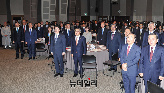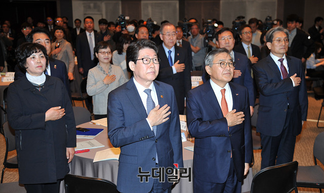 반기문 국가기후환경회의 위원장, 노영민 대통령 비서실장, 조명래 환경부장관, 문길주 미세먼지특별대책위원회 위원장, 박수현 국회의장 비서실장 등 참석자들이 29일 오전 서울 중구 한국프레스센터에서 열린 '미세먼지 문제 해결을 위한 국가기후환경회의 출범식'에서 국민의례를 하고 있다.