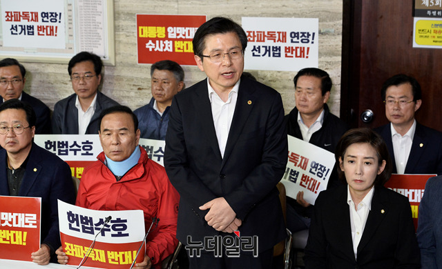 황교안 자유한국당 대표가 29일 오후 국회 사법개혁특별위원회 회의실 앞에서 열린 긴급의원총회에서 모두발언을 하고 있다.