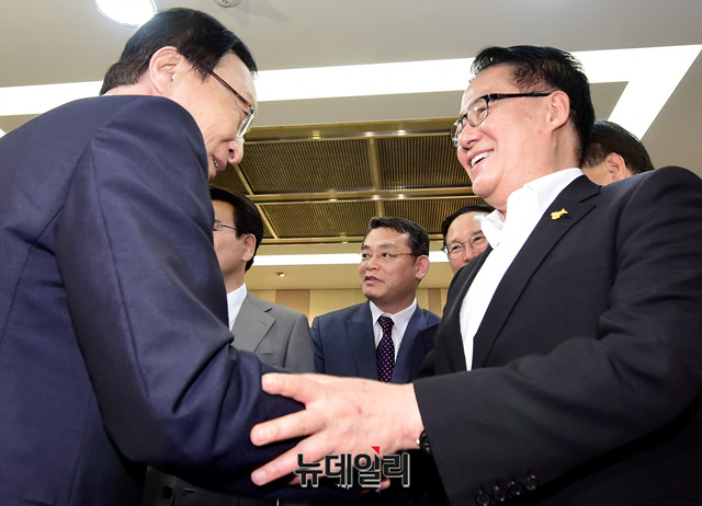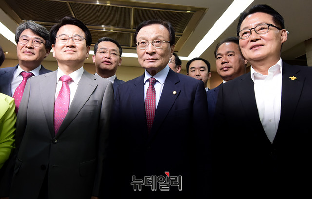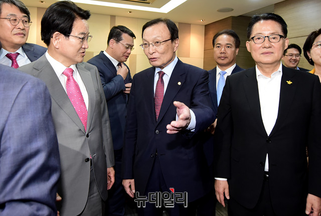 이해찬 더불어민주당 대표, 정동영 민주평화당 대표, 박지원 의원이 29일 오후 국회에서 대화를 한 뒤 기념촬영을 하고 있다.