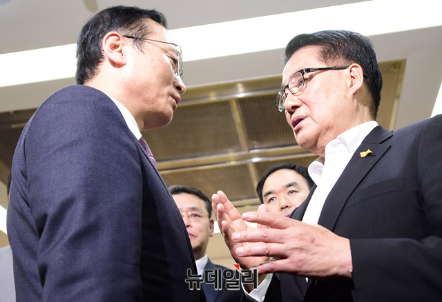 홍영표 더불어민주당 원내대표(왼쪽)와 박지원 민주평화당 의원이 29일 오후 국회에서 대화를 나누고 있다.