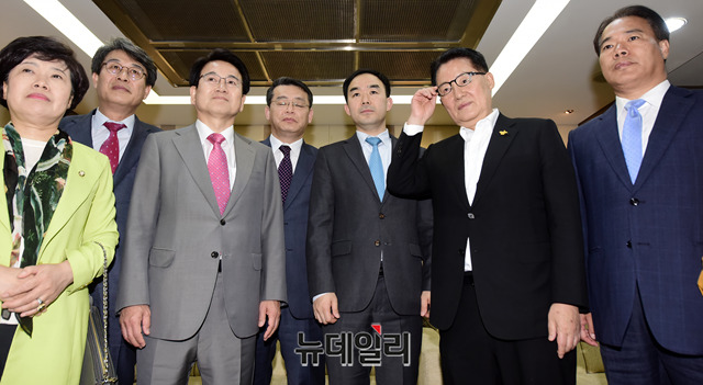 정동영 민주평화당 대표, 박지원 의원, 채이배 바른미래당 의원이 29일 오후 국회에서 기념촬영을 하고 있다.