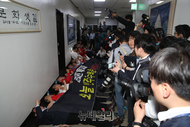 나경원 자유한국당 원내대표 등 소속 의원들이 29일 국회 문화체육관광위원회 회의실에서 열린 전체회의에서 고위공직자범죄수사처(공수처) 법안과 검경 수사권 조정안 등이 패스트트랙 법안으로 지정되자 바닥에 누워 구호를 외치고 있다.