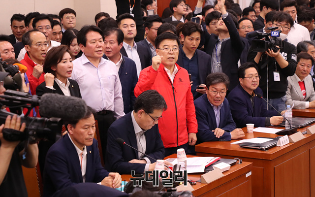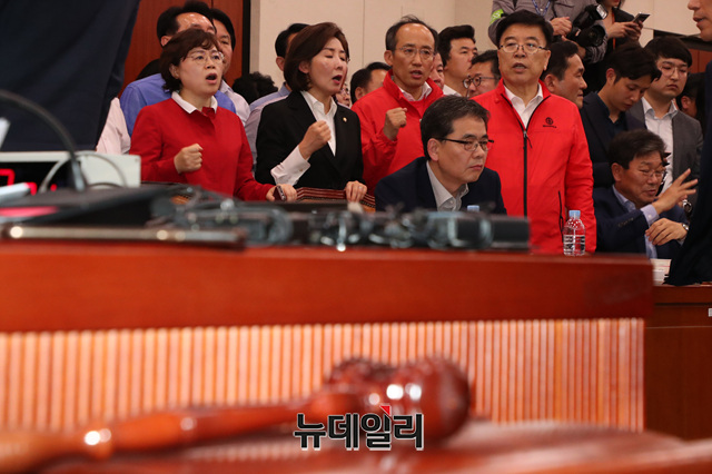 나경원 자유한국당 원내대표 및 소속의원들이 29일 국회 문화체육관광위원회 회의실에서 열린 사법개혁특위 전체회의에서 '좌파독재 반대' 구호를 외치고 있다.