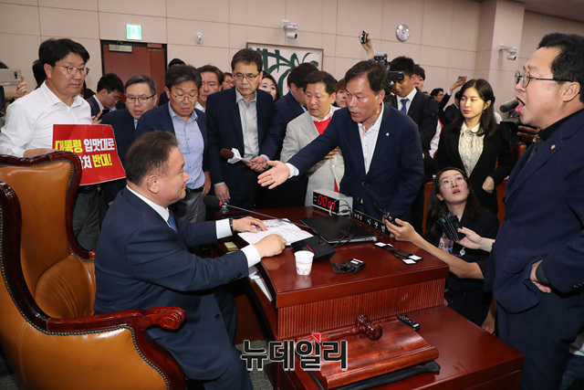 [포토] 이상민 사개특위 위원장에게 항의 하는 자유한국당