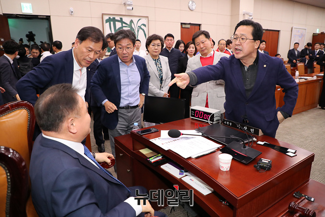 자유한국당 의원들이 29일 국회 문화체육관광위원회 회의실에서 열린 사개특위 전체회의에 참석해 이상민 사법개혁특별위원회 위원장에게 회의절차를 항의를 하고 있다.