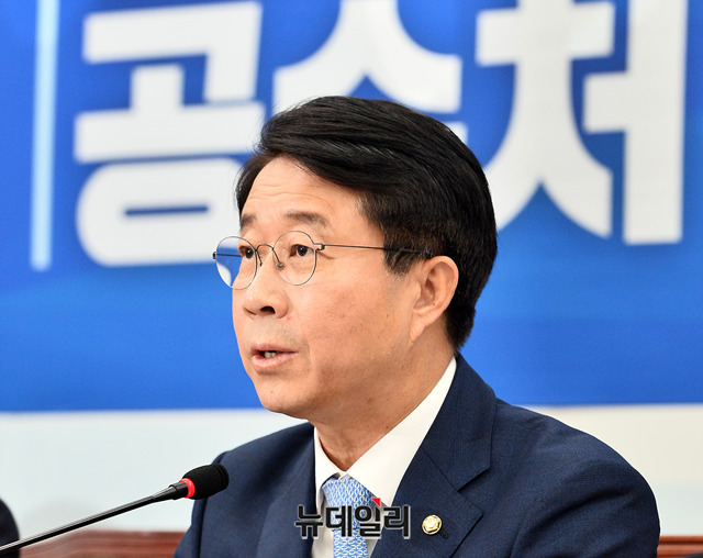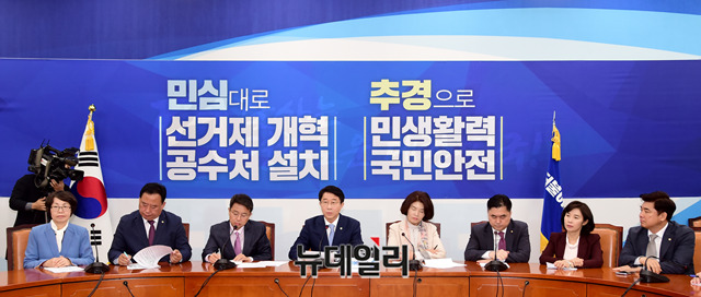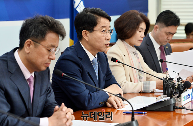 조정식 더불어민주당 정책위의장이 30일 오전 국회에서 열린 원내대책회의에서 모두발언을 하고 있다. 조 정책위의장은 이날 "여야4당이 선거제 개편과 공수처 설치안 등을 신속처리안권으로 지정했다"며 자유한국당의 국회 복귀를 촉구했다.