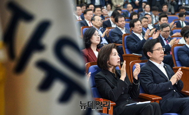 황교안 자유한국당 대표, 나경원 원내대표가 30일 오전 국회에서 열린 의원총회에서 박수를 치고 있다.