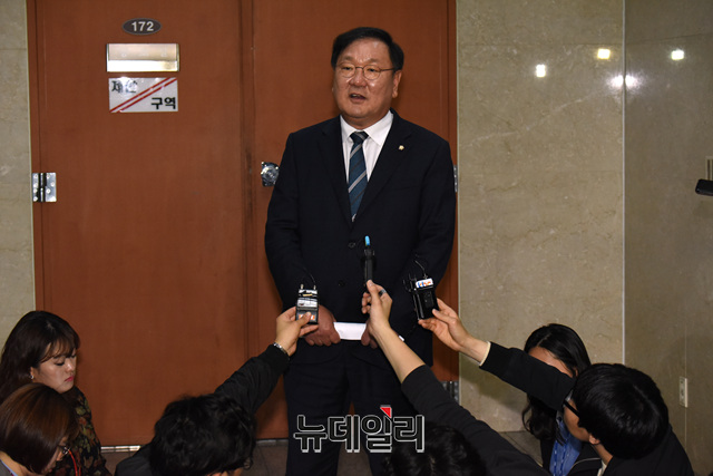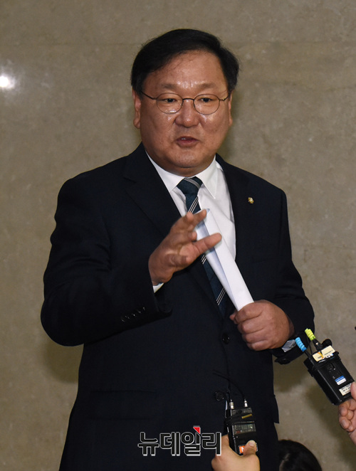 김태년 더불어민주당 의원이 30일 오후 국회 정론관에서 원내대표 경선 출마선언을 미치고 기자들의 질문에 답하고 있다.