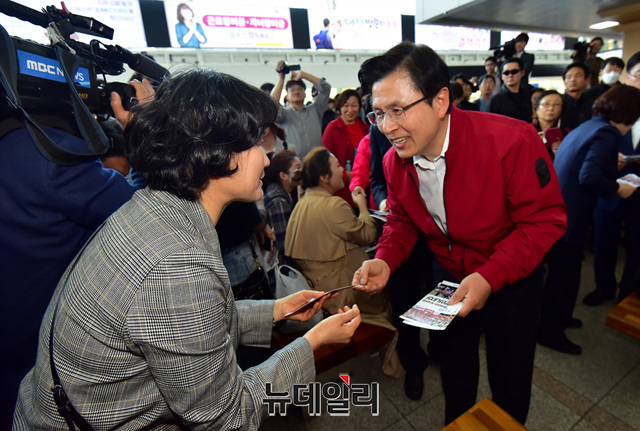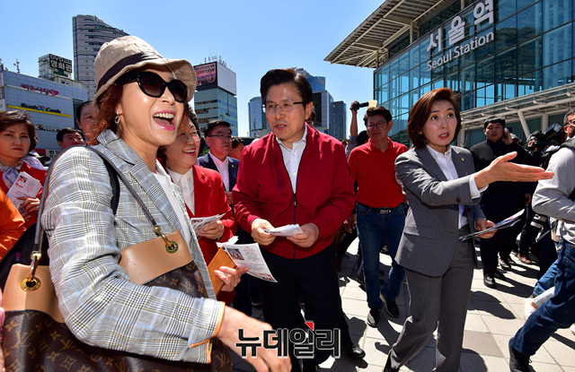 황교안 자유한국당 대표, 나경원 원내대표 등 소속당 의원과 당협위원장들이 2일 오전 서울 용산구 서울역광장에서 열린 '문재인 STOP! 서울시민이 심판합니다' 규탄대회 직후 시민들에게 안내자료를 나눠주고 있다.
