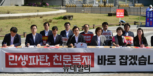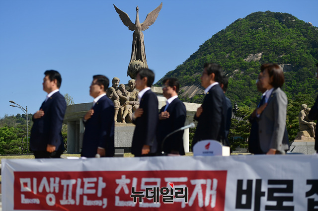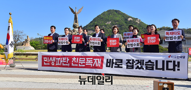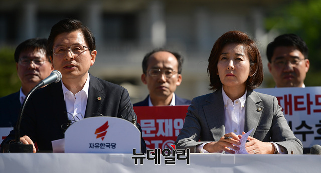 황교안 자유한국당 대표와 나경원 원내대표 등 한국당 지도부가 2일 오전 청와대 앞 분수대광장에서 현장 최고위원회의를 갖고 문재인 정권을 규탄하는 구호를 외치고 있다.