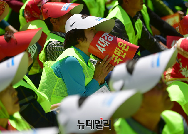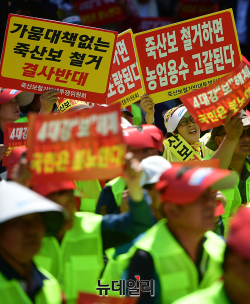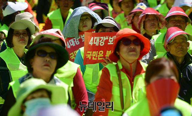 4대강 보 해체 저지 투쟁 범국민대회 참가자들이 2일 오후 서울역광장에서 열린 국민대회에서 4대강 보 해체를 반대하는 구호를 외치고 있다. 이날 열린 범국민대회는 '4대강보해체저지범국민연합' 출범 이후 처음 열린 대규모 집회로 4대강 인근 지역 농민들이 대규모로 참석했다.