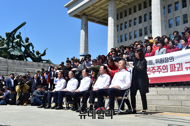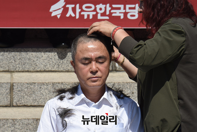 자유한국당 의원 및 원외지역위원장이 2일 오전 국회 본청에서 '문재인 좌파독재정부의 의회민주주의파괴 규탄 삭발식'을 갖고 있다. (오른쪽부터 윤영석, 이장우, 김태흠, 성일종 의원, 이창수 충남도당 위원장)