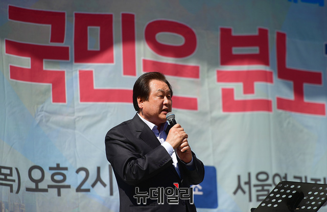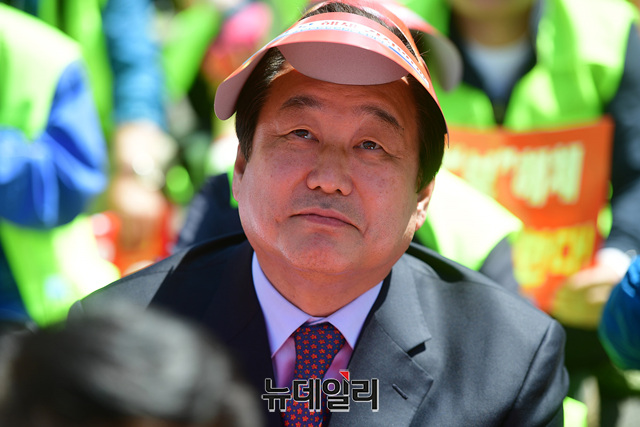김무성 자유한국당 의원이 2일 오후 서울역광장에서 열린 '4대강 보 해체 저지 투쟁 제1차 범국민대회'에서 발언 후 단상을 내려오고 있다. 이날 열린 범국민대회는 출범 이후 첫 대규모 집회로 4대강 인근 지역 농민들이 대규모로 참석했다.