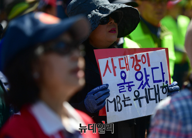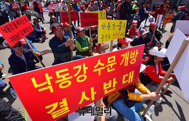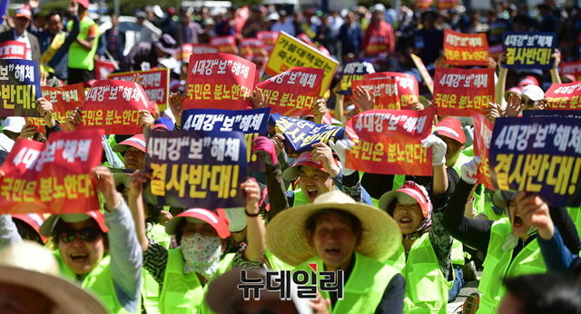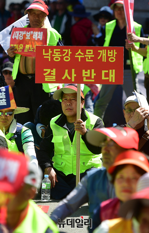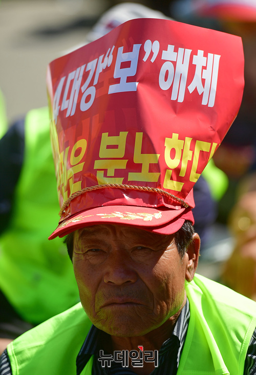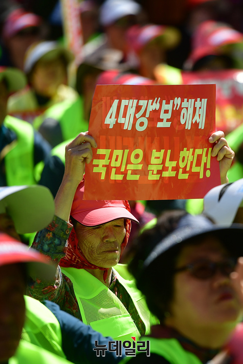 4대강 보 해체 저지 투쟁 범국민대회 참가자들이 2일 오후 서울역광장에서 열린 국민대회에서 4대강 보 해체를 반대하는 구호를 외치로 있다. 이날 열린 범국민대회는 '4대강보해체저지범국민연합' 출범 이후 처음 열린 대규모 집회로 4대강 인근 지역 농민들이 대규모로 참석했다.